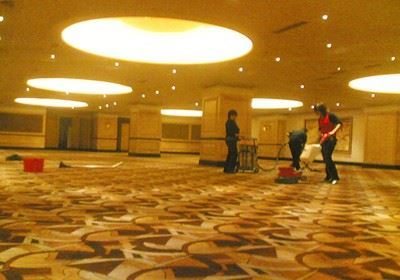 2、清洗地面使用多功能洗地机,配合吸尘吸水机及洗石水等清洁工具和药剂进行清洗。